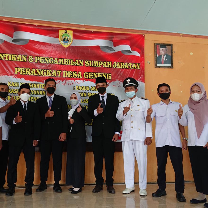 Bertempat di Balai Desa Geneng Kecamatan Miri pada Hari Rabu tanggal 29 Desember 2021 mulai pukul 09.00 – 12.00 WIB dilaksanakan Pengambilan Sumpah Jabatan dan Pelantikan Perangkat Desa Geneng atas nama Bagus Asli dengan jabatan Kasi Kesejahteraan; Ryan Shoim As’admi dengan Jabatan Kasi Pelayanan; Salasun Istidamatil Badriyah dengan Jabatan Kaur Perencanaan dan Erlangga Tyar Agusta dengan jabatan Kaur Tata Usaha dan Umum.