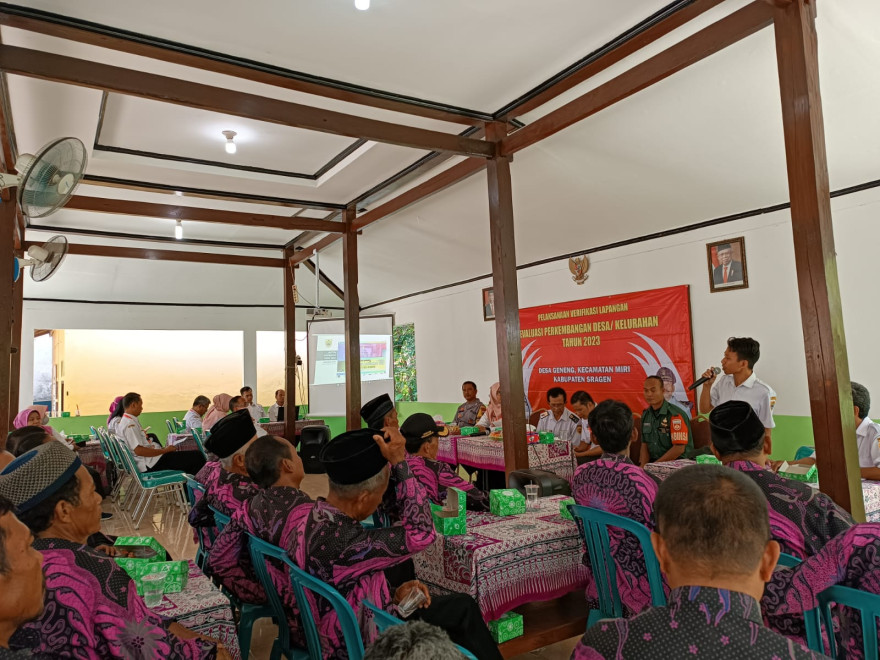 Desa Geneng mengikuti Verifikasi Lapangan Evaluasi karena Desa Geneng masuk 7 (tujuh) desa terbaik dan 3 (tiga) keluragan yang lolos Verifikasi Administrasi Lapangan, dan yang perlu disiapkan adalah : 1) Paparan Kades Mengenai Profil, Dokumen; 2) Data Terkait Penilaian, 3) Video Dokumentasi dengan durasi 5 (lima) menit .