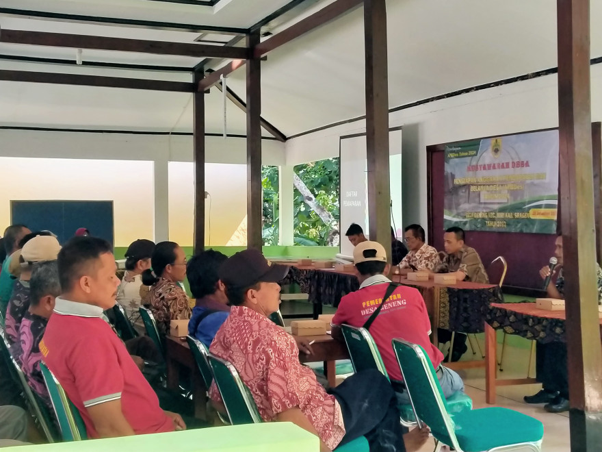 Pada hari ini rabu tanggal dua puluh tujuh bulan desember tahun Dua Ribu Dua Puluh Tiga bertempat di Balai Desa Geneng, Badan Permusyawaratan Desa (BPD), Desa Geneng, Kecamatan Miri Kabupaten Sragen mengadakan rapat dalam rangka membahas rancangan Anggaran Pendapatan dan Belanja Desa (APB Desa) Tahun Anggaran 2024.