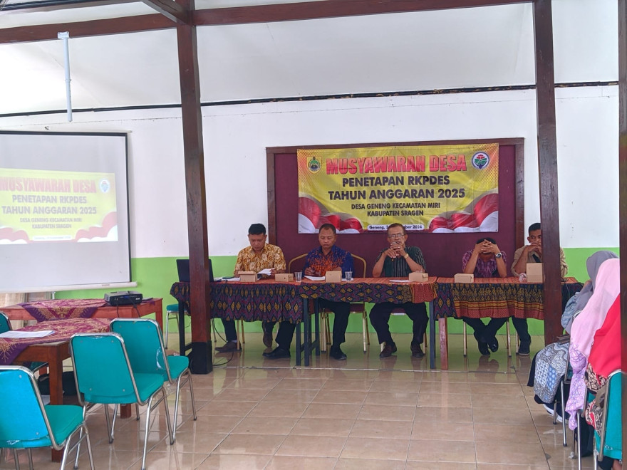 Berkaitan dengan pelaksanaan kegiatan musyawarah Desa, di Desa Geneng, Kecamatan Miri, Kabupaten Sragen Provinsi Jawa Tengah dalam rangka Penyusunan RKP Desa tahun 2025, maka pada hari ini: