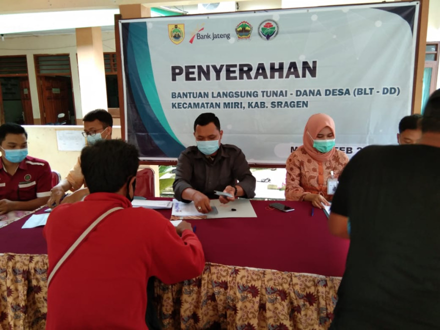 Anggaran BLT-Dana Desa ini sebenarnya telah masuk ke rekening kas desa pada tanggal 15 Februari 2021 sebesar Rp.13.500.000,00 (Tiga Belas Juta Lima Ratus Ribu Rupiah) untuk 45 KK RTM, sehingga pada tanggal 25 Februari Telah di Cairkan BLT DD sebesar Rp.13.500.000,00 (Tiga Belas Juta Lima Ratus Ribu Rupiah) untuk 45 KPM di Aula Kecamatan Miri Pukul 13:00 WIB.
