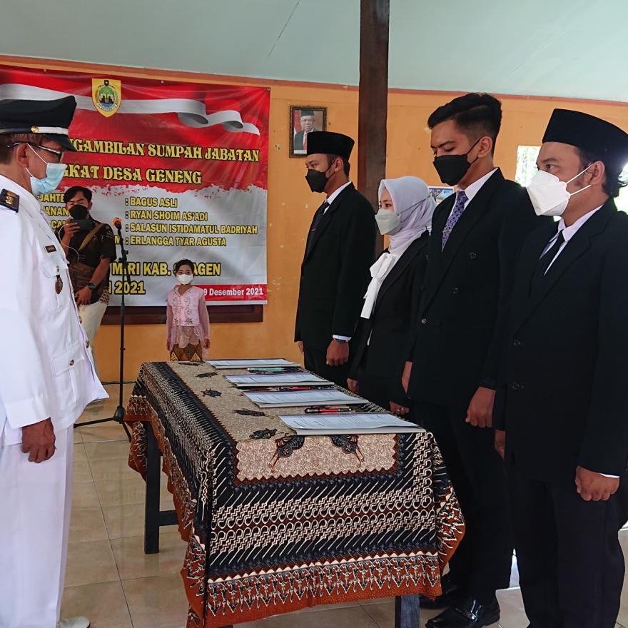 Bertempat di Balai Desa Geneng Kecamatan Miri pada Hari Rabu tanggal 29 Desember 2021 mulai pukul 09.00 – 12.00 WIB dilaksanakan Pengambilan Sumpah Jabatan dan Pelantikan Perangkat Desa Geneng atas nama Bagus Asli dengan jabatan Kasi Kesejahteraan; Ryan Shoim As’admi dengan Jabatan Kasi Pelayanan; Salasun Istidamatil Badriyah dengan Jabatan Kaur Perencanaan dan Erlangga Tyar Agusta dengan jabatan Kaur Tata Usaha dan Umum.