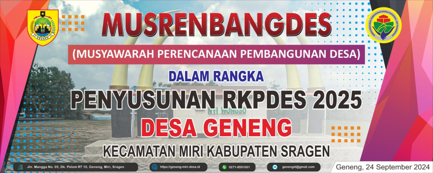 Musrenbangdes ini dilaksanakan oleh Pemerintah Desa dengan mengundang semua tokoh yang ada di Desa Geneng, termasuk BPD, Ketua RT hadir pula Camat Miri, Wakapolsek Miri, Babinsa, Pendamping Desa, PLD, Kepala Puskesmas Miri, Perangkat Desa Geneng, Pengurus TP-PKK, Kepala TK/PAUD, Bidan Desa, Kader Kesehatan, dan Tokoh Masyarakat.