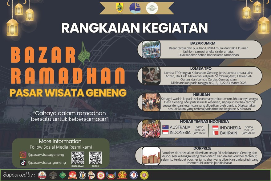 Ramadan merupakan bulan penuh berkah yang tidak hanya dimaknai sebagai waktu untuk meningkatkan ibadah, tetapi juga menjadi momentum untuk membangkitkan semangat ekonomi dan sosial masyarakat. Salah satu kegiatan pemerintah desa geneng yang dapat menjadi sarana pemberdayaan masyarakat dalam menyambut bulan suci ini adalah Bazar Wisata Geneng Ramadan Tahun 2025.
